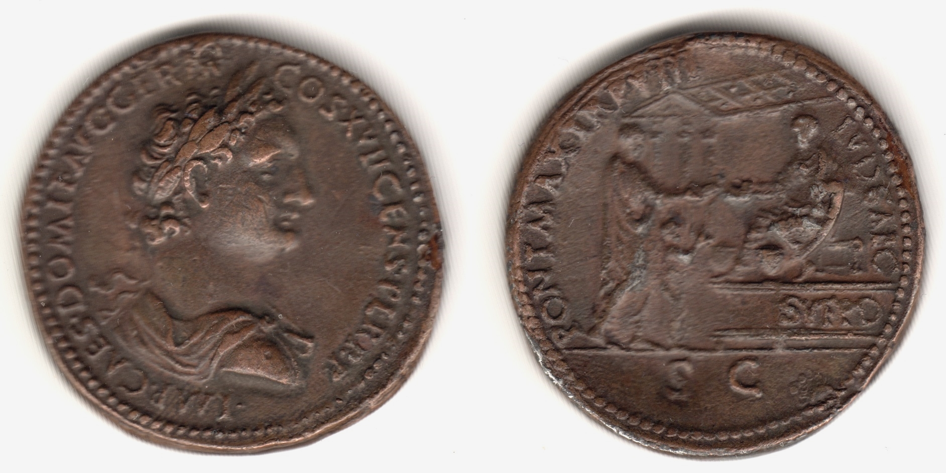 | Reference: Lawrence, Richard Hoe, "Medals by Giovanni Cavino, the 'Paduan', p14, #40. The genuine coin of this type bears on the reverse the inscription COS XIIII LVD SAEC, S C (SVF P D behind temple) and the obverse legend IMP CAES DOMIT AVG GERM P M TR P VIII CENS PER P P It is RIC, vol II, part I (second fully revised edition), p307, #609. Quality: Very Fine+ |