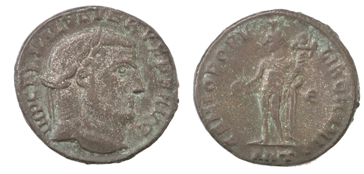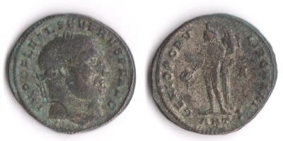 1 listed in the ANS database: ANS 1944.100.64165 (8.55g) (image). Bequest of E.T. Newell; findspot: Cairo, Egypt, 1914. 1 listed at the ANS database ANS 1944.100.64166 (12.16g) (image). Bequest of E.T. Newell; findspot: Cairo, Egypt, 1914. 1 listed in Voetter-Gerin, 1921, p41, #4, collection of Paul Gerin. 2 listed by Bastien, RN 1967, Aleppo, Syria Hoard, table p171. 2 listed by Bastien, RN 1967, Homs, Syria Hoard, table p171. 2 listed by Metcalf, Cairo Hoard, #997, "The «Cairo» Hoard of Tetrarchic Folles", Revue belge de numismatique et de sigillographie 1974, CXX, p. 106 and plate I, #5 (image) and #6 (image); 2 listed by King and Spaer, NC 1977, Northern Sinai Hoard, #3984 (10.22g), #3985 (9.68g). 1 of these pictured on plate 2. (image) 1 ex-Robert Bernobich collection, also listed on Wildwinds.com (9.84g), sold in VAuctions auction 310, lot #266 in Sept 2014 (9.84g) for $ 330,- , listed at NOT in RIC (image) 1 sold at Numismatik Naumann auction 84, lot 481, in December 2019 for 80 Euro (8.06g), listed at NOT in RIC (image). 1 sold on eBay in April 2020 for 83.81 Euro (9.25g), listed at NOT in RIC (image). 1 sold in August 2021 (10.13g) for 85 Euro at Lydia Numsmatics online auction #10, lot 711 (image). ------------ 15 specimens known |