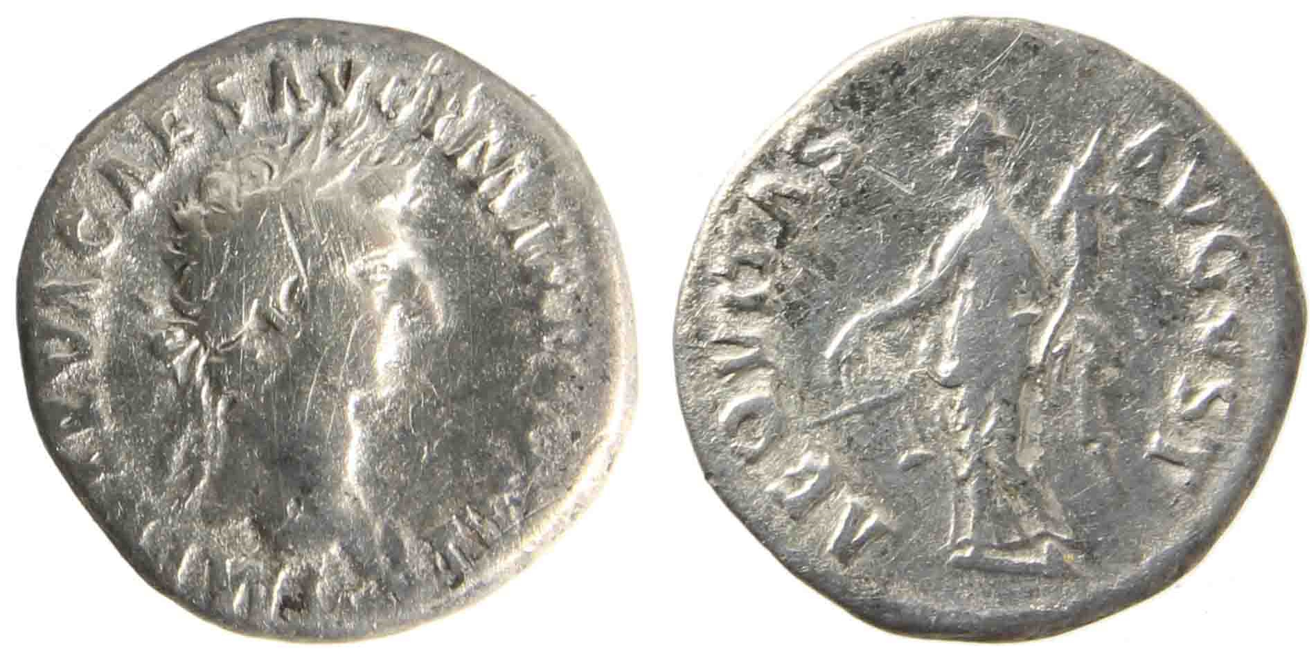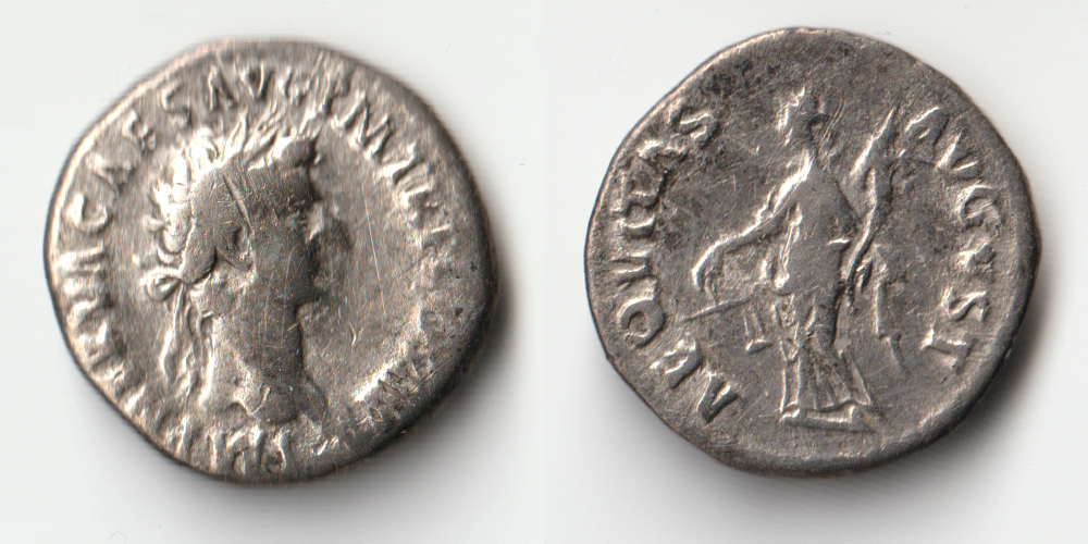 AVGVST Aequitas, standing left, holding scales and cornucopiae. |