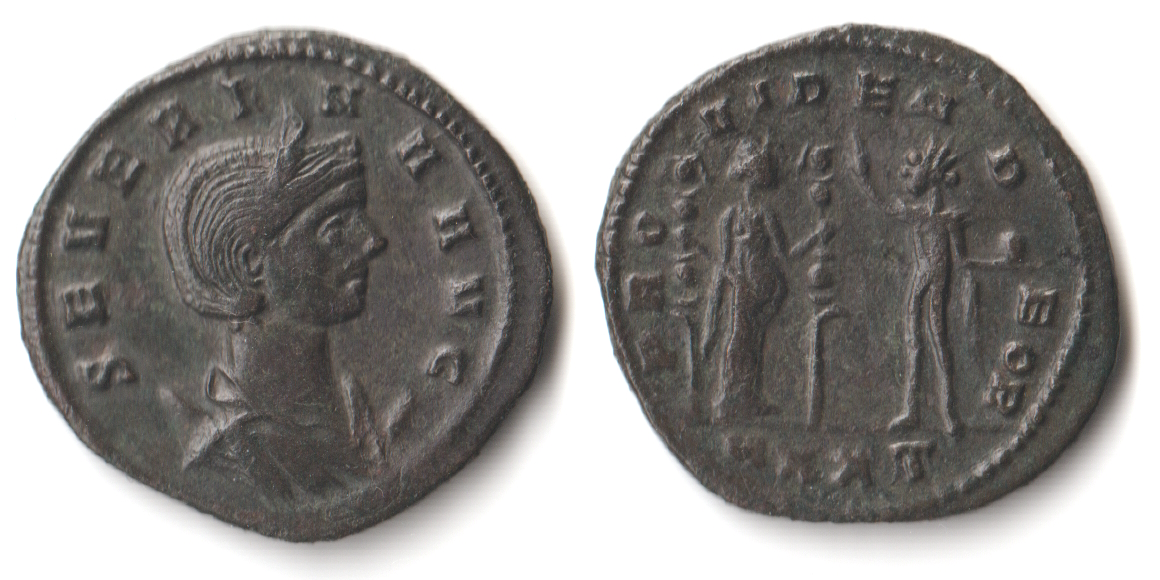 in Ticinum (Pavia, Italy) in 275? A.D. Reference: Webb, P.H., "Roman Imperial Coinage", Volume 5, Part 1 (RIC), p317?, nr. 8. Sear, D.R., "Roman Coins and their Values" (RCV Millennium Edition), Vol. 3, p439, nr. 11706. Cohen, H, "Descriptions Historique des Monnaies frappees sous l'Empire Romain" (C), Vol 6, p210?, nr. 12. Van Meter, D., "Handbook of Roman Imperial Coins" (VM), p258, nr. 4?. Suarez, R., "Encyclopedia of Roman Imperial Coins II" (ERIC II), p642, nr. 64? (B2, O4, R04, T2, M6, Exe: VIXXI) Suarez, R., "Encyclopedia of Roman Imperial Coins II" (ERIC II-Digital), p642, nr. 64? (B2, O4, R04, T2, M6, Exe: VIXXI) Kampmann, U., "Die Münzen der Römischen Kaiserzeit", 2. Auflage (KM2), p352, nr.107.3? Ex Uwe Neumann collection. Quality: Extra Fine+ Rarity: ? |