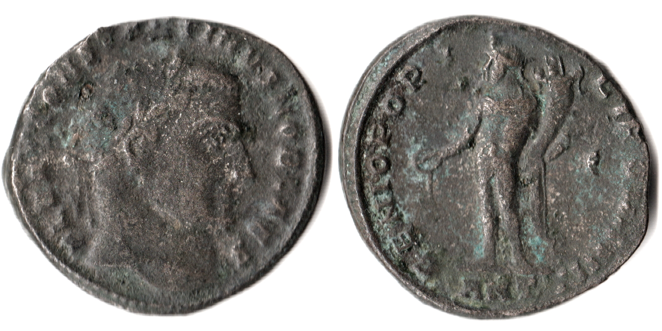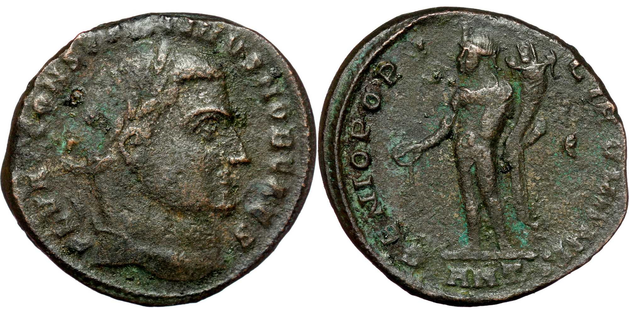 (Antakya, Turkey) between July 306 and early spring 307 A.D. Reference: Voetter, Otto, "Die Münzen der römischen Kaiser, Kaiserinnen und Caesaren von Diocletianus bis Romulus, Katalog der hinterlassenen Sammlung und Aufzeichnung des Herrn Paul Gerin" (Voetter-Gerin), 1921, Constantine Magnus, #1 (specimen in the collection of Paul Gerin, from officina A, Γ and S) -Kent, J.P.C., "The Pattern of Bronze Coinage under Constantine I", Numismatic Chronicle, 1957, p 69, #1086 -Sutherland, C.H.V., "The Roman Imperial Coinage" Volume VI, 1967, p624, note 5: "This issue, save for Constantius, continued without change at the beginning of Group III, except that no coins of Severus as Augustus (though included by Kent, N.C. 1957, p. 69, no. 1084) are known to me". -Sutherland, C.H.V., "The Roman Imperial Coinage" Volume VI, 1967, p627, Note: "As indicated above, p. 624, n. 5, the aes of Group II (ii) continued into Group III with unchanged Genio Populi Romani folles for Galerius and Maximinus (though probably not for Severus as Augustus)....". -Bastien, Pierre, "Trouvaille de folles au Liban (294-307)", Revue Numismatique, 1967, Aleppo & Homs, Syria Hoards, table p171. -Bastien, Pierre, "Trouvaille de folles au Liban (294-307)", Revue Numismatique, 1967, Lebanon Hoard, p188, #76. -King, C.E. & Spaer, A., "A Hoard of Folles from Northern Sinai", Numismatic Chronicle, 1977, p106, #4000-4009. -Salzmann, D., "Folles of Severus II as Augustus and of Constantine I as Caesar from Antioch ", Numismatic Chronicle, 1983, p214-216 and plate 42, #7. See my page on Constantine I as Augustus - The "lost" Genio Populi Romani issue from Antioch This coin is listed at Not in RIC. Quality: Fine+. Rarity: Unclear, but probably Scarce (not rare). So far I have been able to confirm the existence of at least 8 specimens of this coin from officina E, so according to the definition of RIC Vol VI, that would make it's rarity R3 (but there are probably more out there). I also own another specimen from this officina which you can find here. |