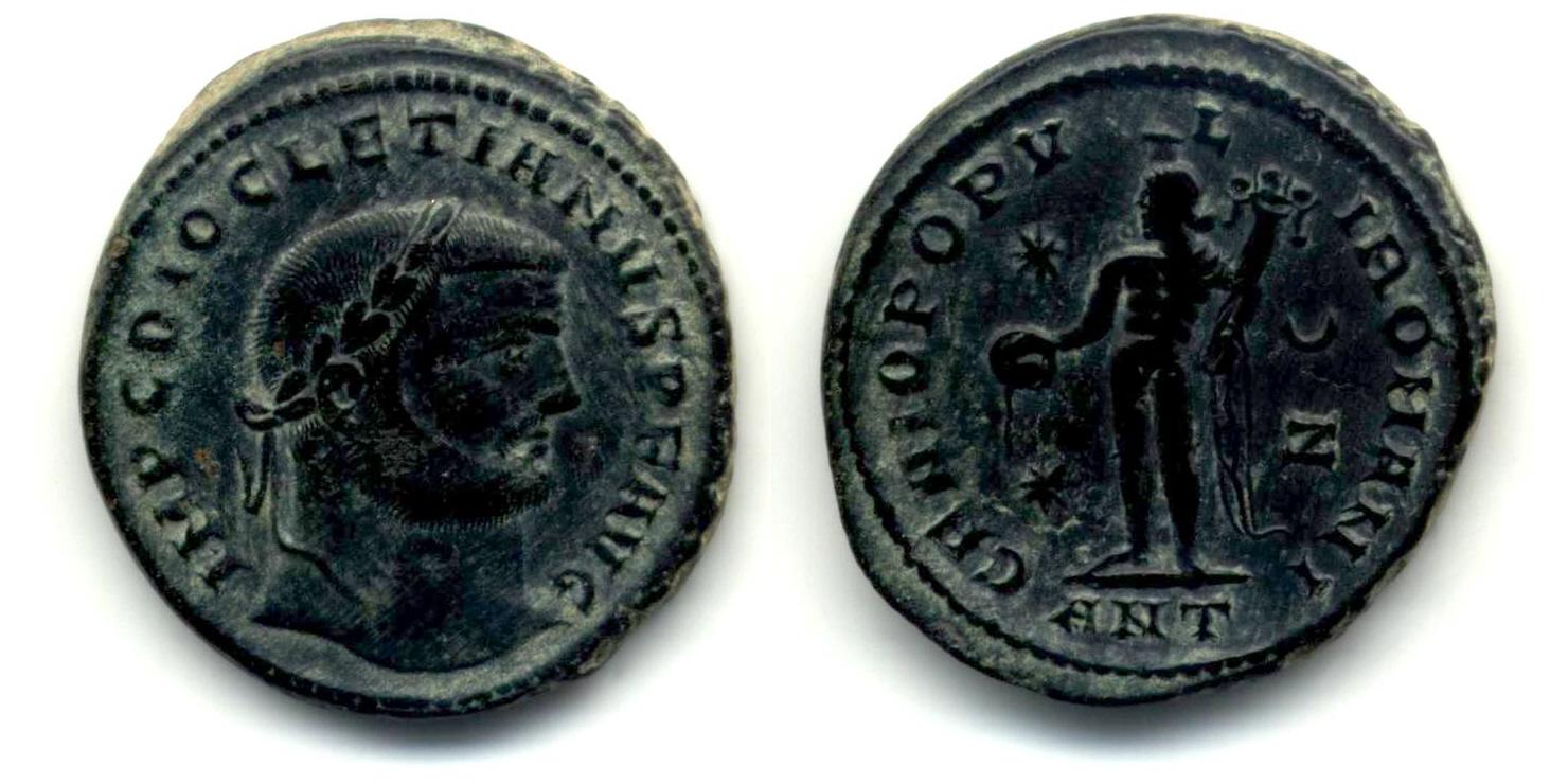 | Obverse - IMP C DIOCLETIANVS P F AVG Diocletian, his laureate head right. |